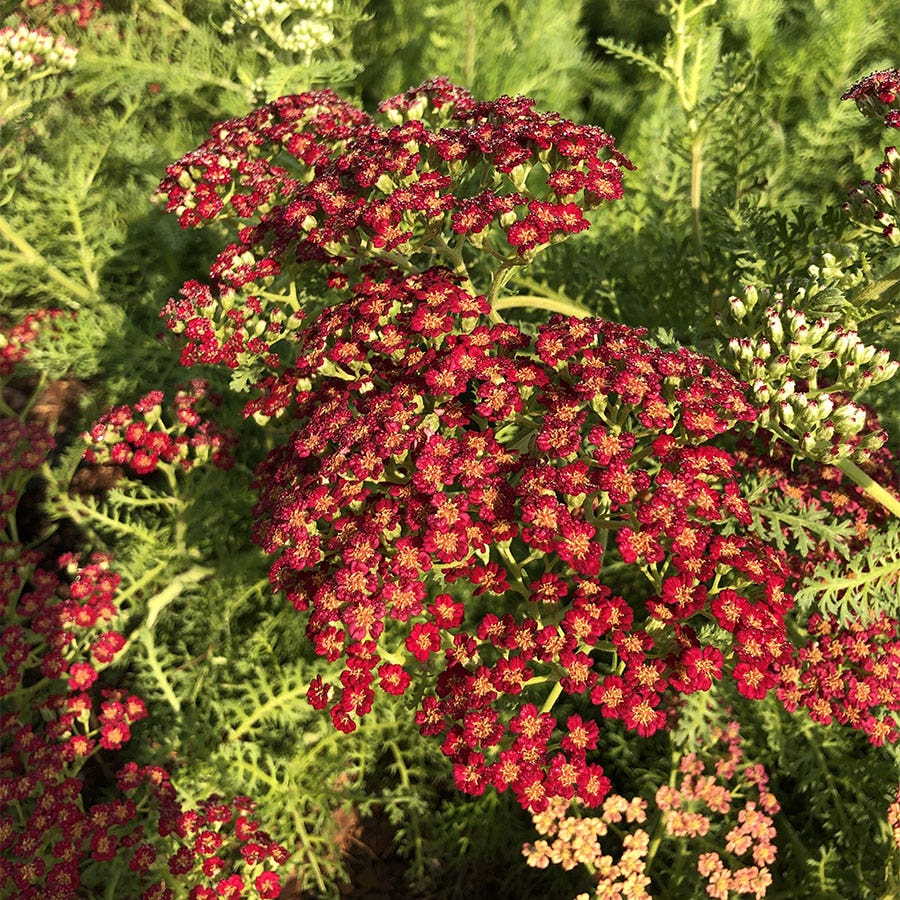 'Lemon Cherry Fizz' is a bold twist on traditional yarrow. Its enticing flower heads mature to a bold red and pollinators find them absolutely irresistible! Unpalatable to deer and rabbits, this perennial is ideal for pest plagued landscapes. Despite its towering habit, 'Lemon Cherry Fizz' is quite durable and its stems are sturdy enough to handle its large blossoms without flopping. It doesn't need much water and performs well even in poor soil, making this yarrow an excellent choice for beginners and chronic "plant killers". Treat your garden to the easy low maintenance beauty of 'Lemon Cherry Fizz'!