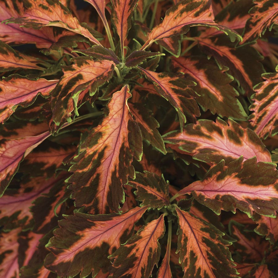 Densely leaved, robust, and rounded, Coral Candy Premium Sun Coleus has a tight, uniformly compact, mounded habit and a fast growth rate. Shown to best effect when grouped or massed, coleus makes beautiful border edging and is great filler for a hanging basket or container garden, outdoors or indoors. Just 3 seeds are enough to amply fill a 14- to 16-inch container.