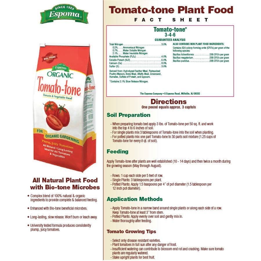 Feed your tomatoes (and other veggies) the natural, safe way. Tomato-tone provides all the macro-nutrients your plants need to produce bumper crops all season long, with a guaranteed analysis of 3% nitrogen, 4% phosphorus, and 6% potassium, plus an infusion of Bio-tone® beneficial microbes that help your plants absorb nutrients and fight off disease. This premium-grade fertilizer contains only nutrient-rich ingredients, with no sludge or fillers. And all this garden goodness comes from all-natural organic ingredients that are completely safe for animals and the environment, and are slow-release so that the nutrients will not 'burn' your plants.