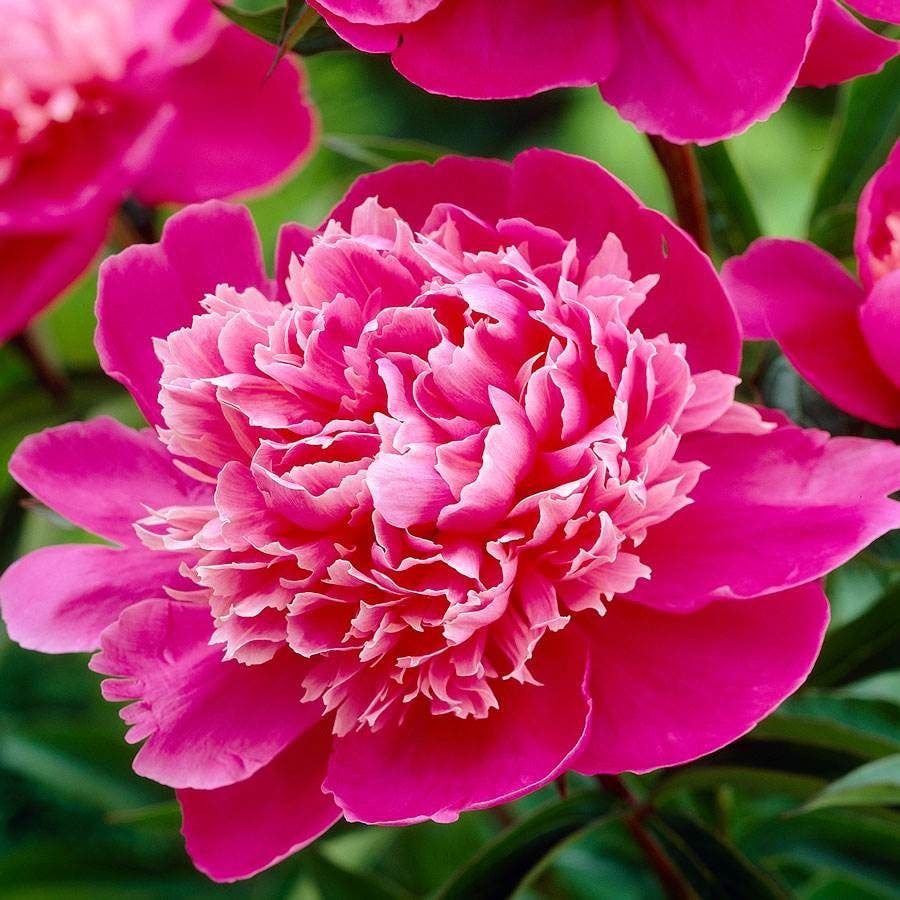 Typical of Paeonia, commonly called peony, 'Madame Emile Debatane' is a long-lived, clump-forming, herbaceous plant. It has a rounded, mounded habit of glossy, dark green foliage and fast growth rate. This peony makes a beautiful specimen but is shown to best effect when grouped or massed in mixed beds and borders. It's a lovely back drop for spring bulbs and a good companion plant for hydrangea, philadelphus, campanula, echinacea, and phlox.