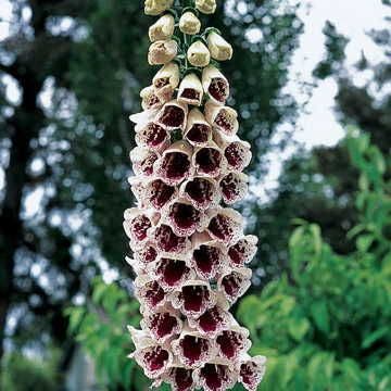 Pam's Choice Foxglove may soon be yours, too, when you grow these stately 3- to 4-foot spikes and watch as the sedate white budscrowded along the upper ¾ of the sturdy stalksopen to magnificent, deep maroon throat. The maroon becomes spotted and speckled toward the petal edges, adding even more interest to this very unusually-colored plant. And because the large flowers open from the bottom of the spike up, Pam's Choice Foxglove plant boasts fresh blooms for weeks. A distinctive choice for city or country gardens, combining elegant colors with the cottage-garden appeal of this garden classic.