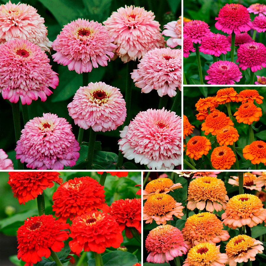 Zinderella zinnias grow in a flash and bloom heavily. Cut-and-come-again annuals, they set new buds as soon as the old flowers are cut or deadheaded, so they repeat reliably all summer. Zinderella blooms are long-lasting in garden or vase. The blooms attract pollinators and "good bugs" that can help repel pests from vegetable crops and other flowering varieties, so scatter your zinnias where you like—they help the whole garden. And this collection offers every Zinderella Zinnia for a rainbow of color.