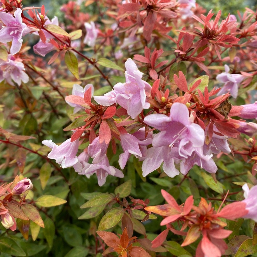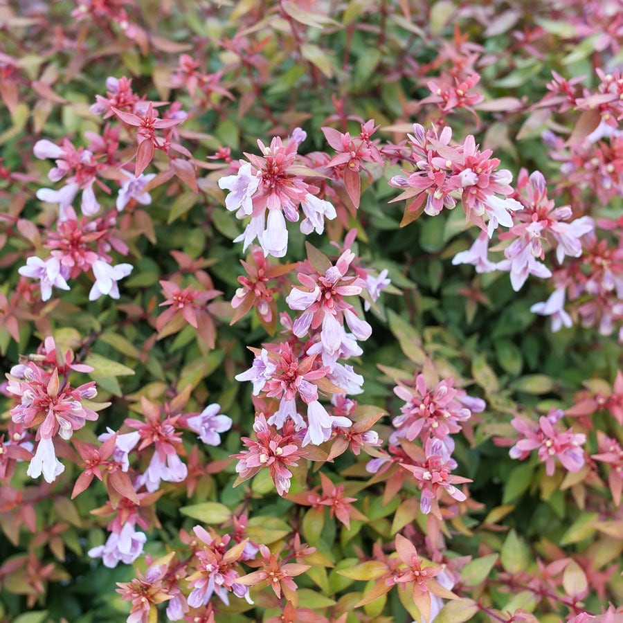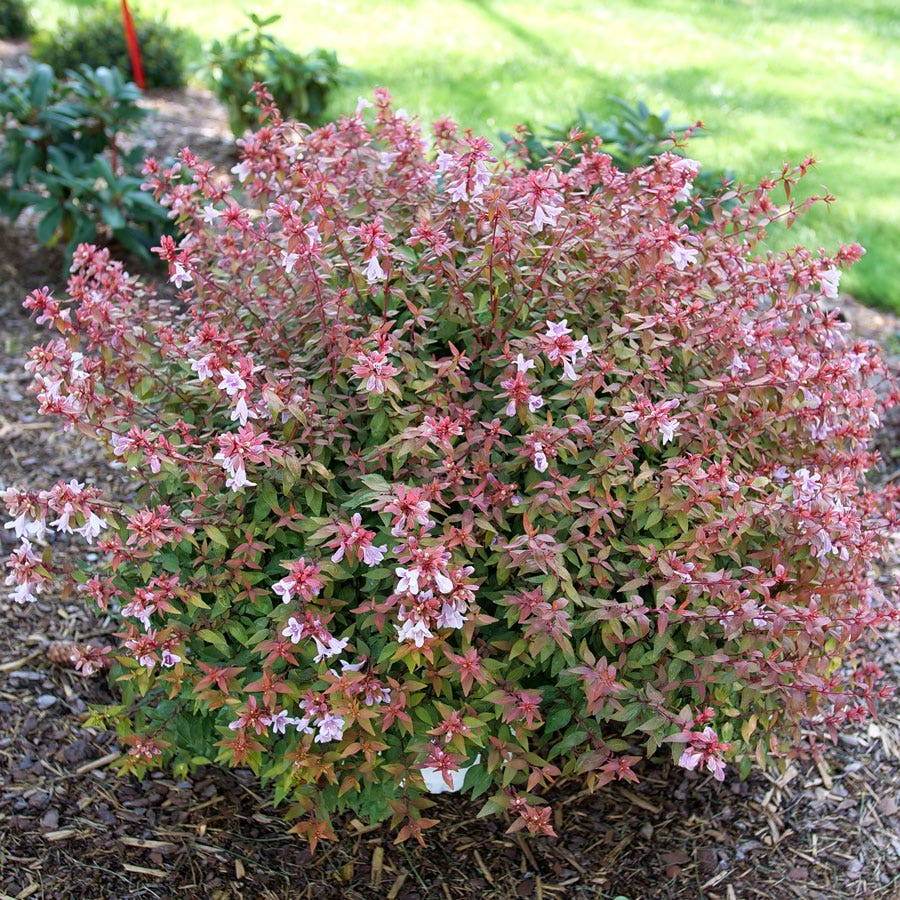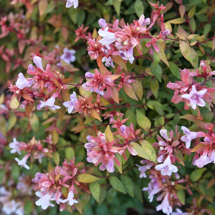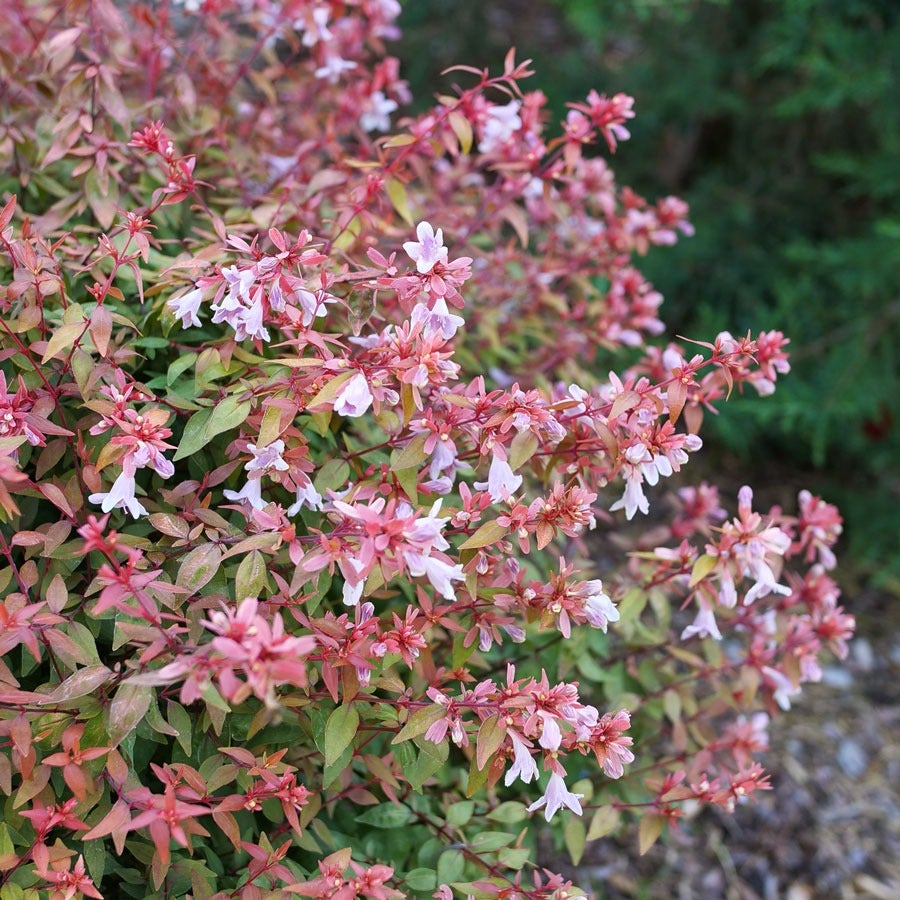 A Proven Winners® ColorChoice® Flowering Shrubs variety, Abelia Poco Loco™ is a compact semievergreen perennial shrub grown for its attractive foliage and months of fragrant flowers. Its slender, gracefully arching dark-red stems bear bright yellow and orange foliage in spring that matures to green with pinkish red new growth. Clusters of bell-shaped pink flowers sustain pollinators throughout summer, including bees, butterflies, and hummingbirds.