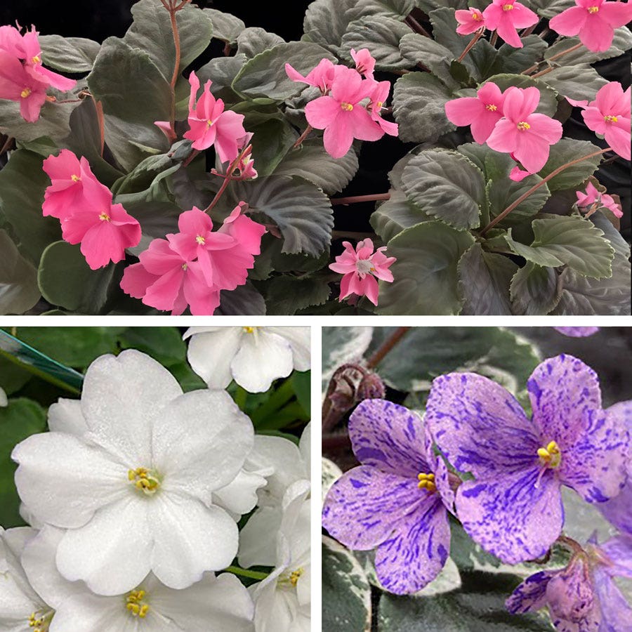 African Violet Little Gems are adorable new varieties that are fun and rewarding to grow. The plants are on the smaller side, typically growing 3 to 8 inches in diameter. Grown under ideal conditions, these charming houseplants flower profusely several times a year, beginning 6 to 9 months after sprouting. The pink, white, red, and blue blooms, some with blotches or streaks, are perched atop thick, fuzzy green foliage, with some plants having variegation.