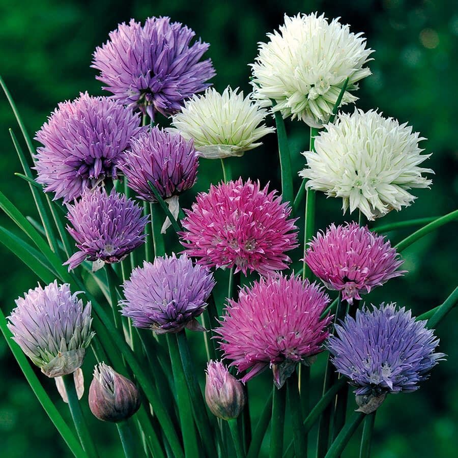 Easy to grow, low maintenance, and cold hardy to Zone 3, this ornamental chive mix of small bulbous perennials form dense clumps of blue-green tubular foliage. The plant flowers in clusters of pink, white, and lavender blooms that can be used as a garnish. It is self-seeding, if not dead-headed, and easily divided.