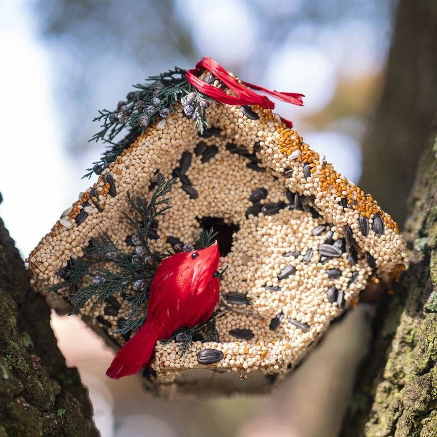 Enhance your garden with the Wren Birdseed Casita, a charming birdhouse smothered with premium seeds that attract birds and invite them to stay awhile. Decorated with sprigs of juniper berries, a whimsical cardinal, and a bright red raffia bow, this birdhouse is as attractive as it is functional.