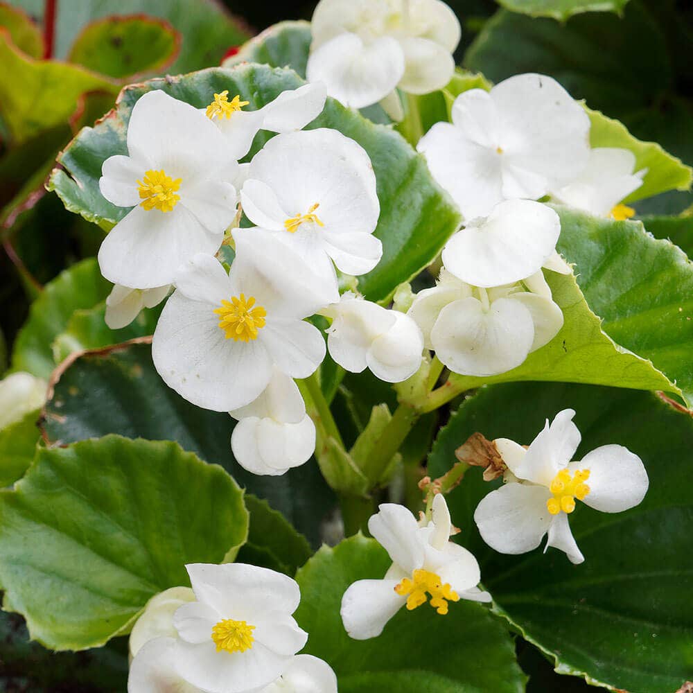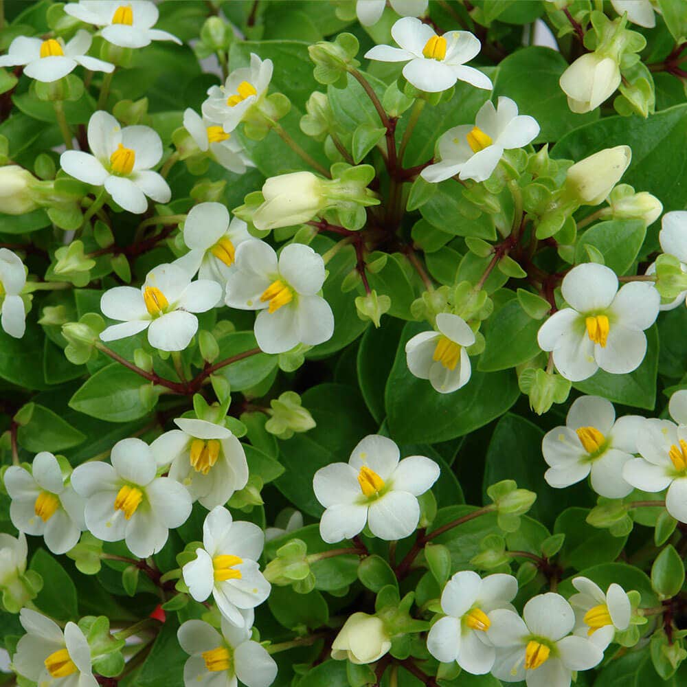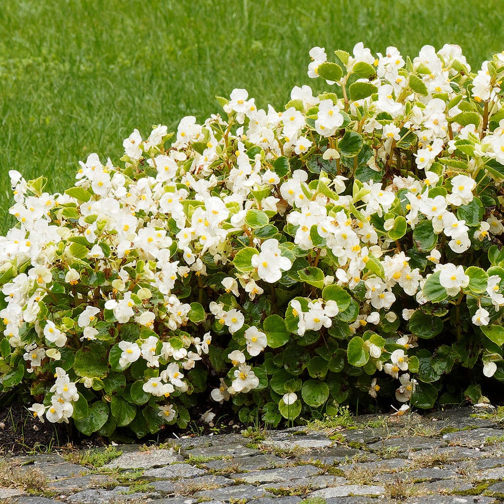 At 8 to 10 inches tall and wide, these uniform, mounded plants are just the right size for the border or for edging, but they really excel in a mass garden bed planting. The 1½-inch blooms arise all over the plantsright down to the ground on all sides. And face up and out for maximum show. The large, waxy green foliage is attractive, toothough it may vanish beneath the blooms.