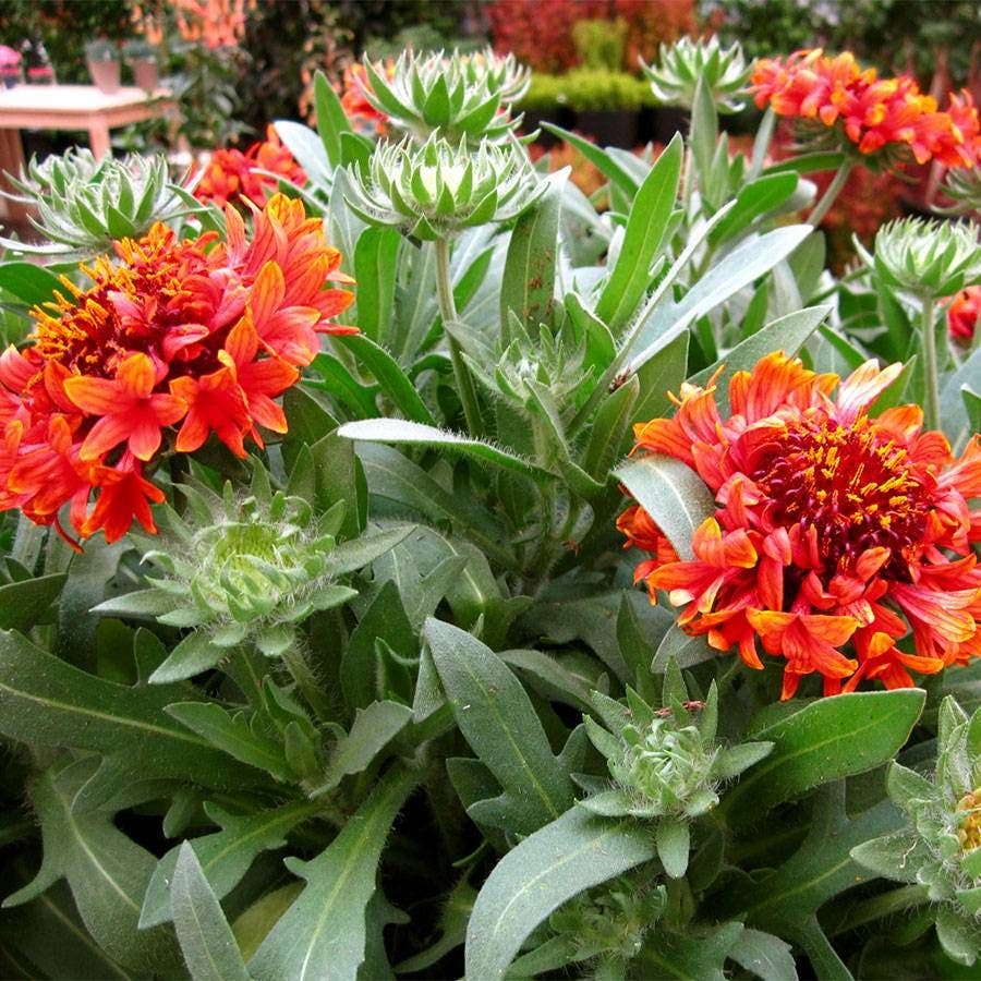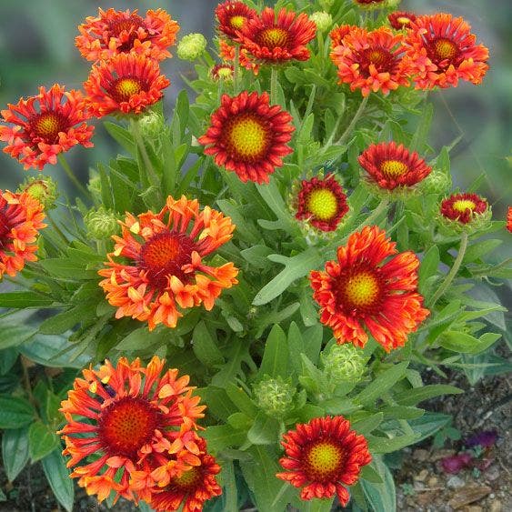 Gaillardia 'Fanfare Blaze' shines in the landscape with incredible pinwheel shaped flowers in a orange and red. The blooms are contrasted against grey green foliage. It will not only light up your landscape in the spring but it comes back for a repeat show in the fall.