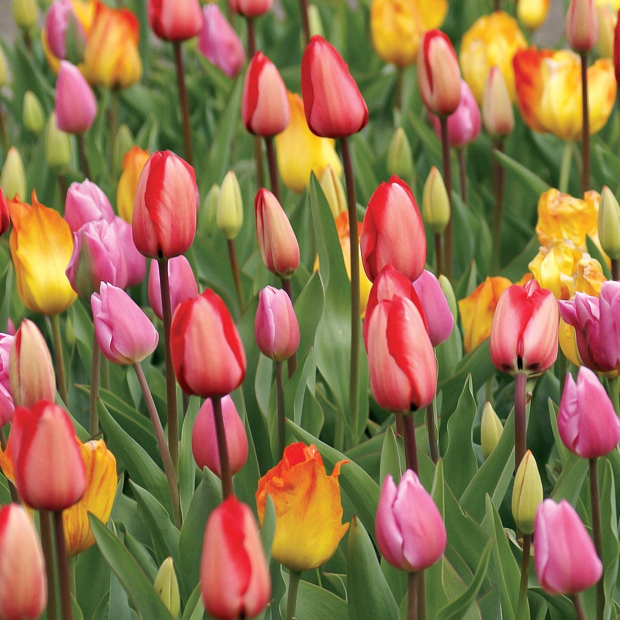 Tulips are a fantastic addition to the garden and landscape: they are low-maintenance, rarely need to be watered, and they bloom very early in the season with gorgeous, vase-shaped blooms on strong stems. They would be the perfect flower if not for their one weakness: a limited bloom time. Well, this carefully crafted Marathon Mix of tulips solves this problem by staggering early-, mid-, and late-season tulips together so that the color show can last all spring, adding gorgeous blooms for months. As one bloom fades, another rises to take its place. The Marathon Mix Tulip bulbs includes bright whites, pinks, and yellows punctuated with more dramatic violets, reds, and bicolors. The color composition is sure to dazzle garden guests and passers by, and all these blooms are borne on plants selected for their strong stems and great performance.