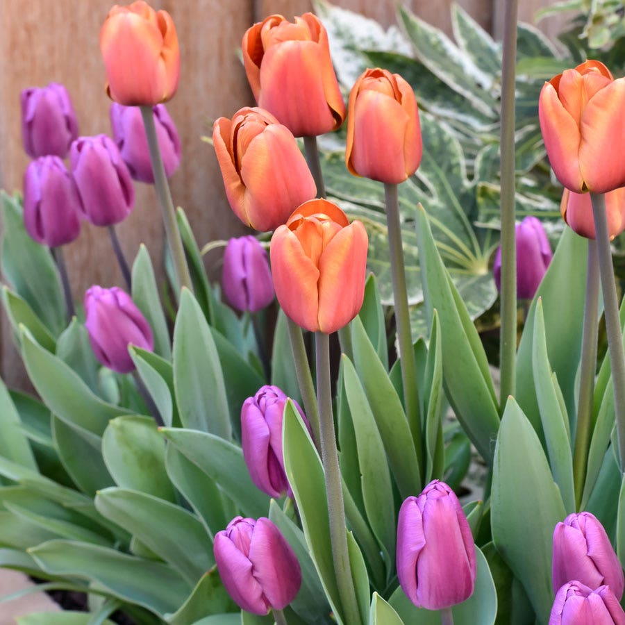 Plant Sunset Skies, a blend of triumph tulips, in early to mid-fall, and in mid to late spring these spring ephemerals bloom in a mix of solid rose-violet flowers with a blue satin sheen and multicolored flowers in pink, orange, and purple hues. Borne singly on long, strong stems the large, sweetly fragrant, cup-shaped blooms make excellent cut flowers.