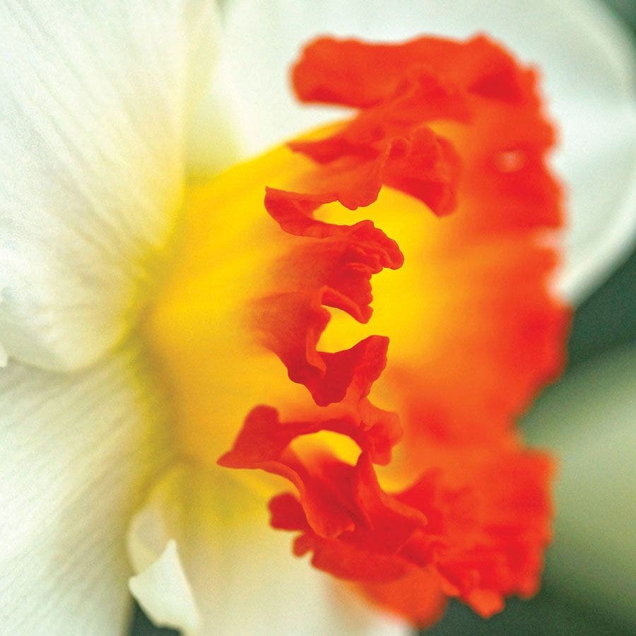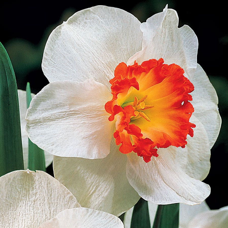 You may find yourself humming a Johnny Cash song as you gaze at the beautiful red-edged center of this magnificent daffodil. 'Ring of Fire' Daffodil is known for its rich red accents, which decorate the large ivory cup of this pure white flower. One of the showiest yet for garden or vase.