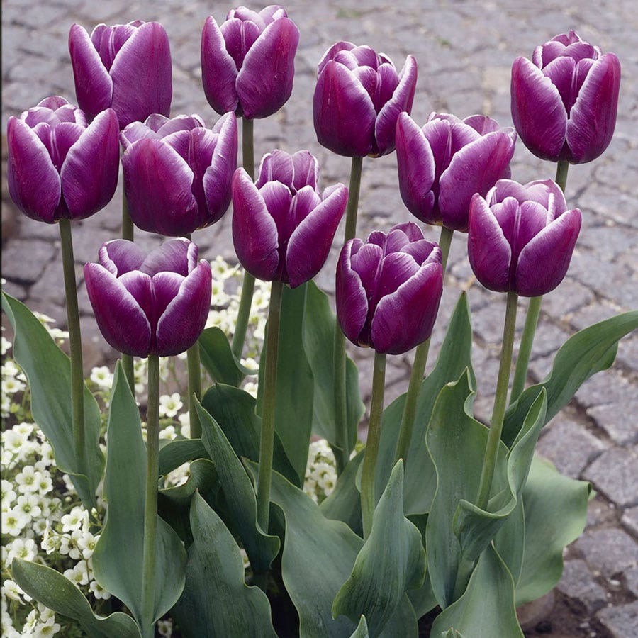 Tulipa Arabian Mystery is a striking triumph tulip, celebrated for its exquisite bicolor blooms that delight with their velvety richness and elegant detailing. These tulips, with their deep, velvety purple petals bordered by a delicate, gauzy alabaster edge, are a true testament to the beauty and sophistication of spring. When they begin to bloom in mid to late spring, Arabian Mystery tulips create a mesmerizing display, with each goblet-shaped flower rising singly atop tall, sturdy stems that reach 16 to 18 inches in height. The flowers are complemented by a fan of lance-shaped grey-green leaves, adding a graceful backdrop to the blooms.