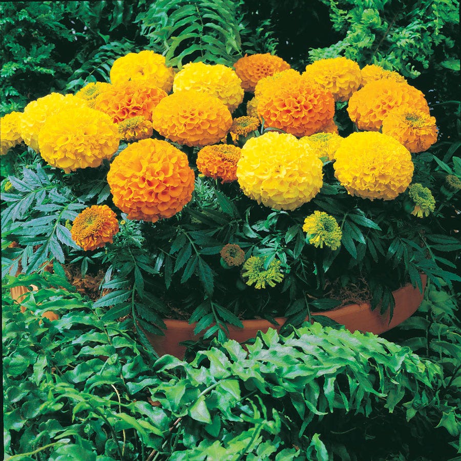 Blooming longerby farthan any other marigold, Antigua wins the flower power award. But the huge, gorgeous 3-inch globes of yellow, gold, and orange aren't the only great thing about this hybridit's also a very tough, compact garden performer that starts blooming just 60 days from sowing and develops a dense habit that can't be beat.