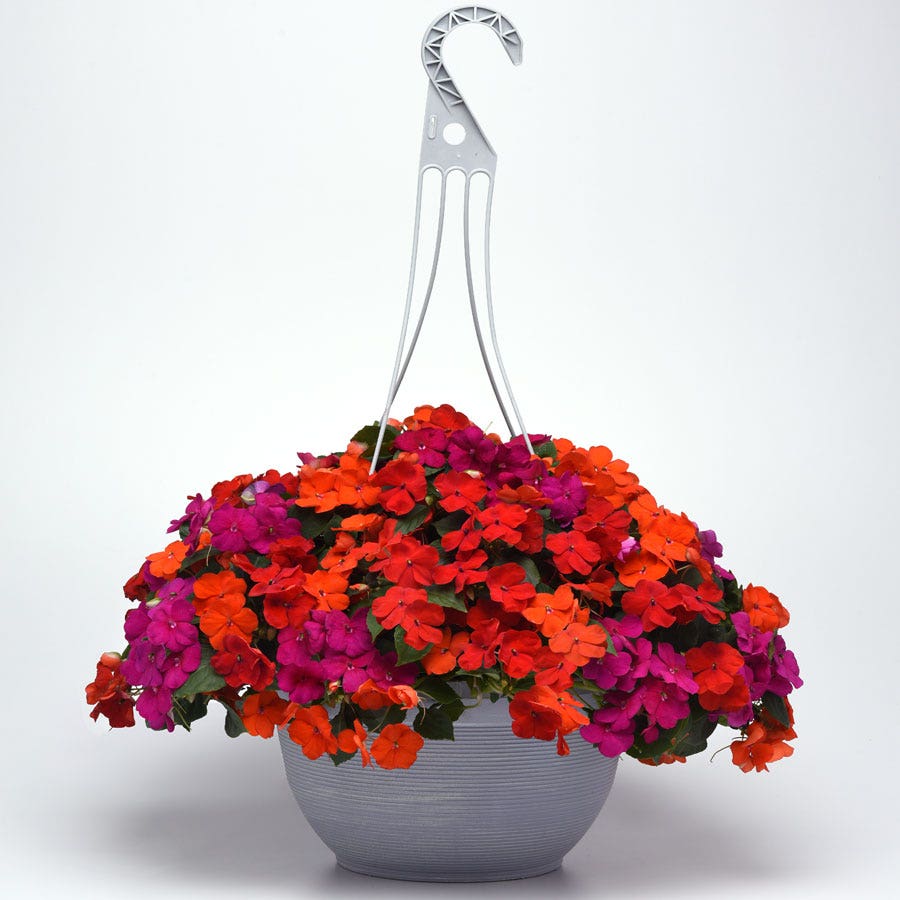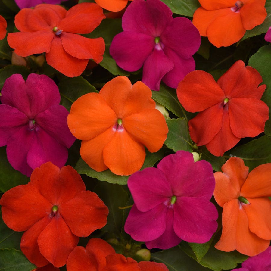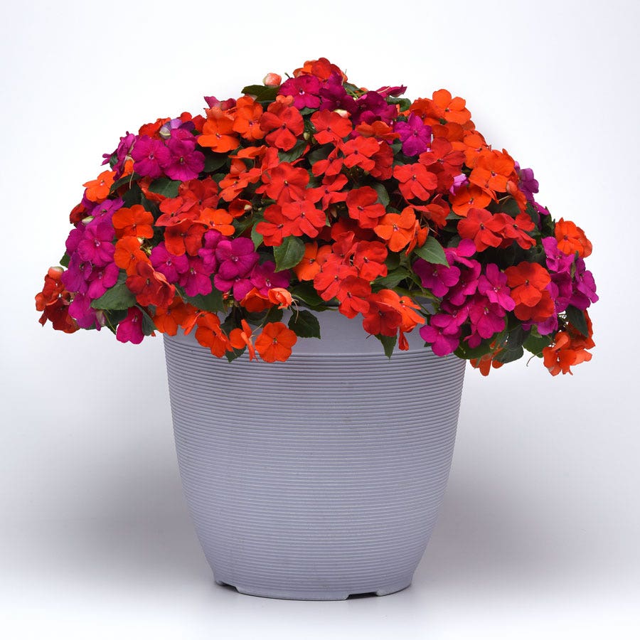 Beacon® Sanibel Mixture contains Impatiens walleriana varieties, also known as busy lizzy, that are tender perennials, usually grown as annuals, offering spring through late summer interest. A stunning combination of bright red, orange, and violet blooms cover the plants non-stop all season.