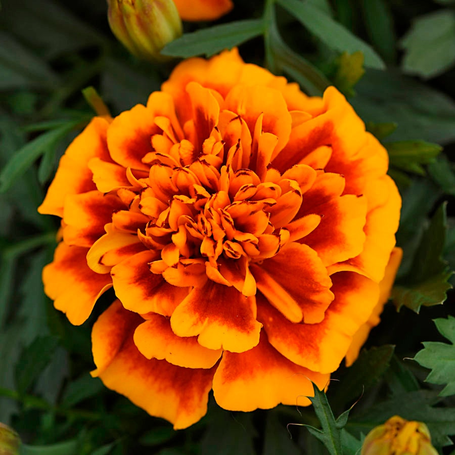 Bonanza™ Flame, an early flowering, dwarf French marigold, is an annual offering spring through late summer interest, blooming until first frost in some regions. Heavy blooming, the plant sets 2- to 3-inch, double-crested, orange and mahogany bicolor blossoms. The showy, long-lasting flowers attract bees, butterflies, and hummingbirds to the garden.