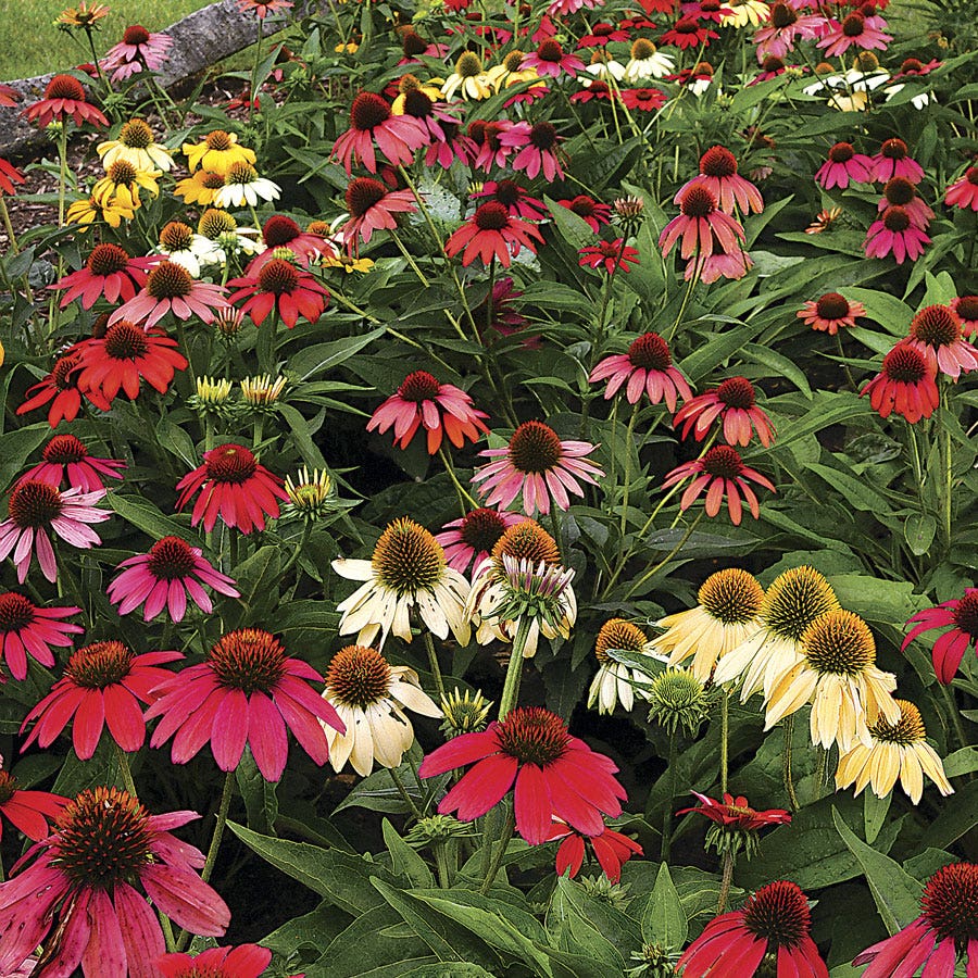 Bright daisies of cream, yellow, gold, orange, scarlet, red, and purple top these stocky little plants from midsummer all the way into fall, replacing themselves without you having to cut or deadhead them. Every color in the mix reaches about the same size, and the flowers are very long lasting in garden or vase. Best of all, Cheyenne Spirit demonstrates great resistance to wind and rain, bouncing back after a storm much more effectively than other Echinacea varieties.