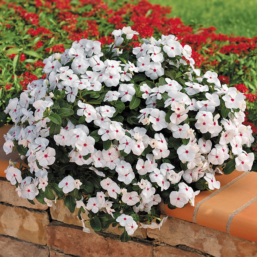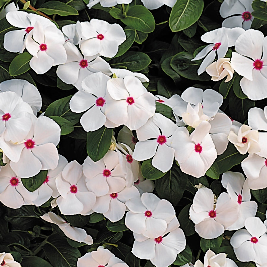 Just 6 to 8 inches high, Cora® Cascade Polka Dot Vinca spreads 32 to 36 inches wide, with flowers every inch of the way. The blooms are very evenly distributed, eliminating the "bald spots" that plague some vinca. And Cora® Cascade Polka Dot Vinca flowers are a bit larger than most other vincas', standing out brilliantly against glossy, dense green foliage. You can see the vigor in every leaf and bloom of Cora® Cascade Polka Dot Vincait just looks healthy and ready to flourish.