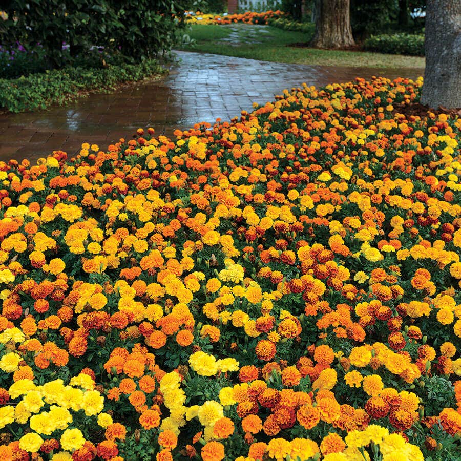 Hot Pak™ Mixture Marigolds create mounds of foliage and full blooms in shades of vibrant yellow, rich orange, and scarlet. Some blooms are solid colors, while others are multicolored. The blooms hang around longer than African type marigolds, providing blooms right up until the frost, and they won't fall over.
