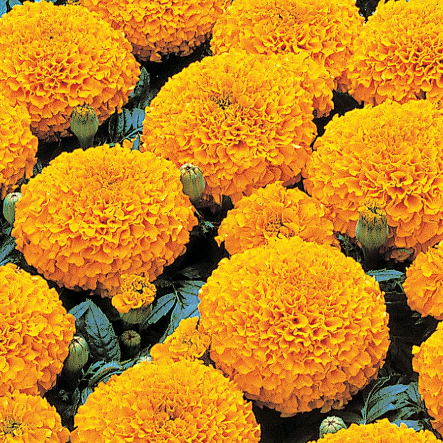 These bright orange flowers are simply stuffed with short, quilled petals, so symmetrical and beautifully rounded that they scarcely look real. A closely-spaced planting of Park's Whopper is a real delight, because when the plants begin blooming, you literally have a solid wall of flowersno foliage or ground visible in between.