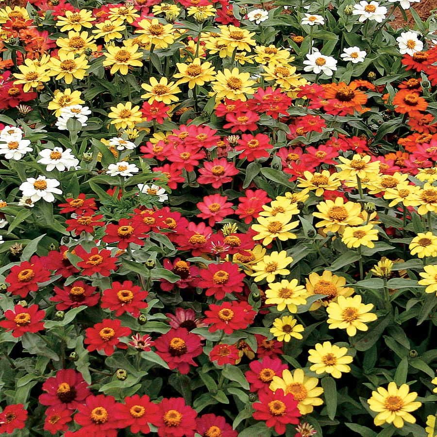 These bushy plants, 14 to 18 inches high and 20 to 24 inches wide, are simply smothered nonstop all season with cheerful daisy-formed blooms. This mix brings you all the single Profusions, from the original yellow and orange to white, apricot, coral pink, fire, and cherry. Ideal for large plantings, they fill in the available space brilliantly, and just keep going no matter what.