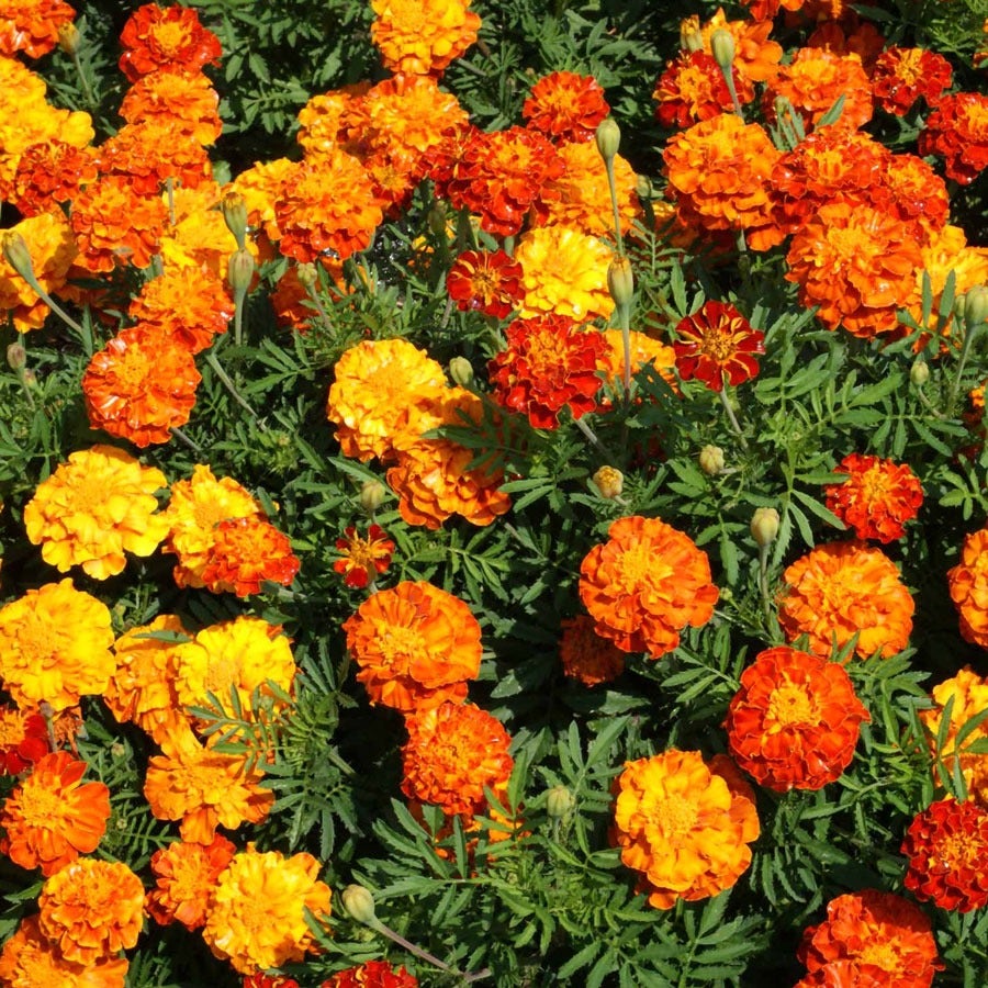 The Marigold 'Sparky Mix' contains Tagetes patula varieties, commonly called French marigolds. The plants have excellent branching and a uniform, upright, mounding habit of aromatic, finely divided, bushy foliage and a vigorous growth rate. Shown to best effect when massed or grouped, 'Sparky Mix' French marigolds are perfect for beds, borders, and containers; and they're an absolute must in a pollinator garden. French marigolds are excellent companion plants for organic vegetable gardens, as they offer natural pest control. They are well-known for repelling insects in the garden and are often grown alongside perennials as well as vegetables as they repel whiteflies and kill bad nematodes.