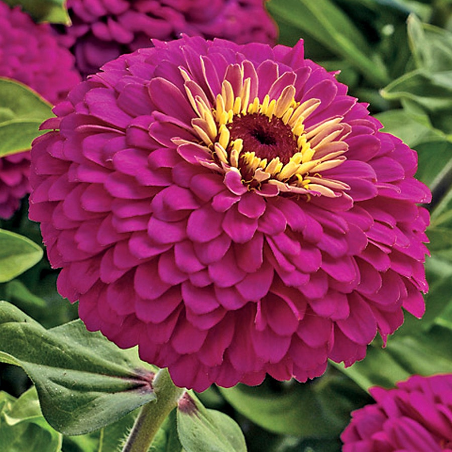 These blooms measure 4 to 5 inches wide and more than an inch high, packed with zingy magenta-rose petals and sporting a merry little yellow "crown" at the center. If a more perfectly shaped zinnia has ever been grown, I've not seen ityou'll be amazed as these plants pop out bloom after bloom, all equally petal-packed and nicely shaped.