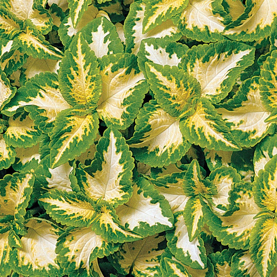 Wizard® Jade Coleus is a tropical evergreen tender perennial, typically grown as an annual, offering late spring through autumn interest. Grown for its vibrant, colorful foliage, Wizard Jade has cream-colored leaves with bright green edges. Late-flowering, the plants produce small, nettle-like flowers, summer to early fall. However, the flowers are not particularly attractive and are typically removed to conserve energy, so the gorgeous foliage will last longer.