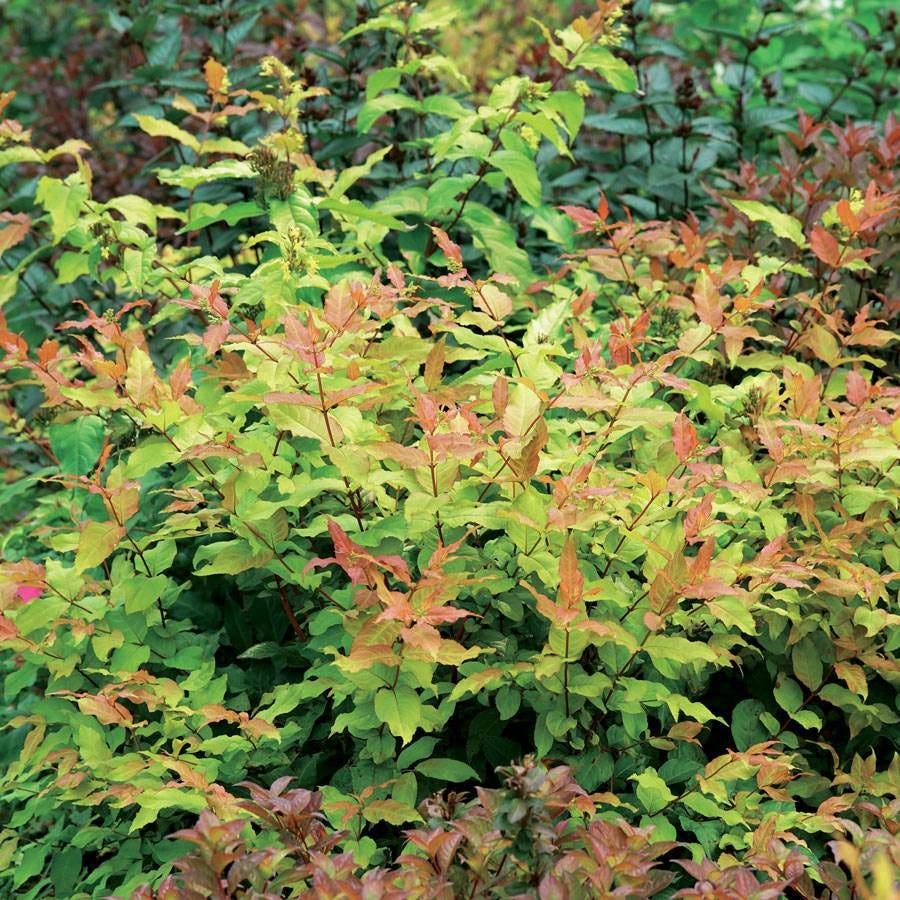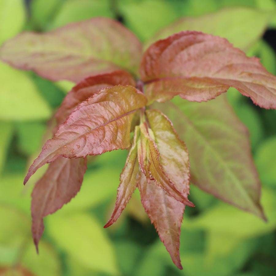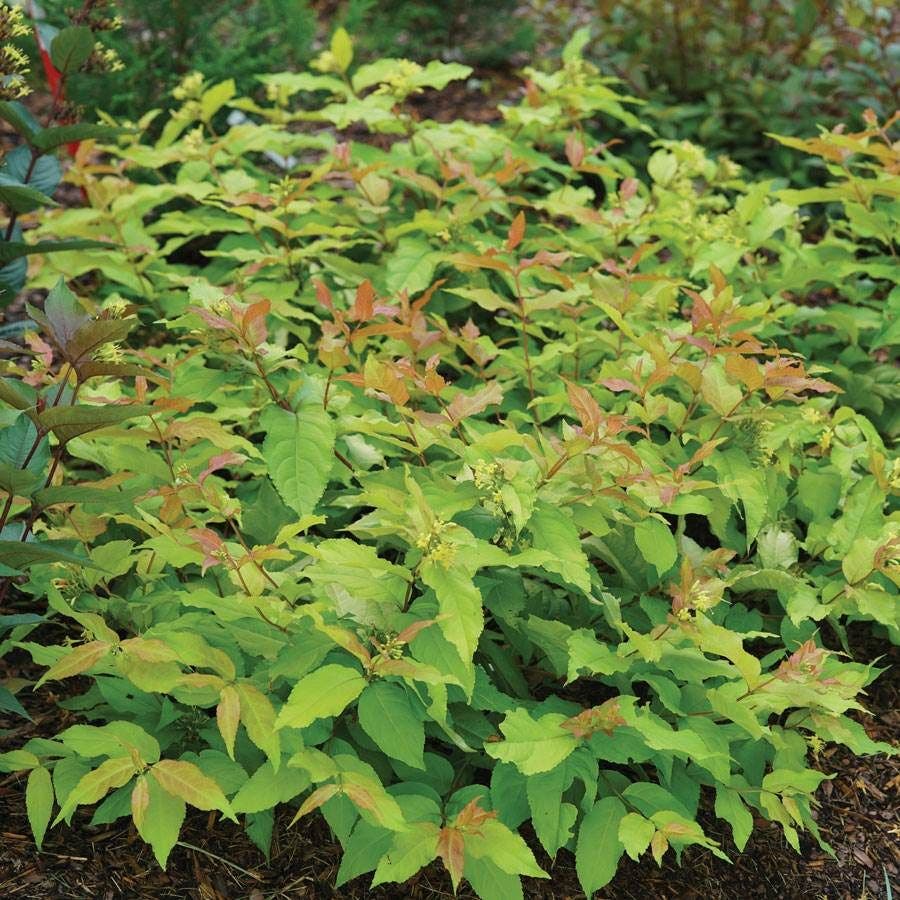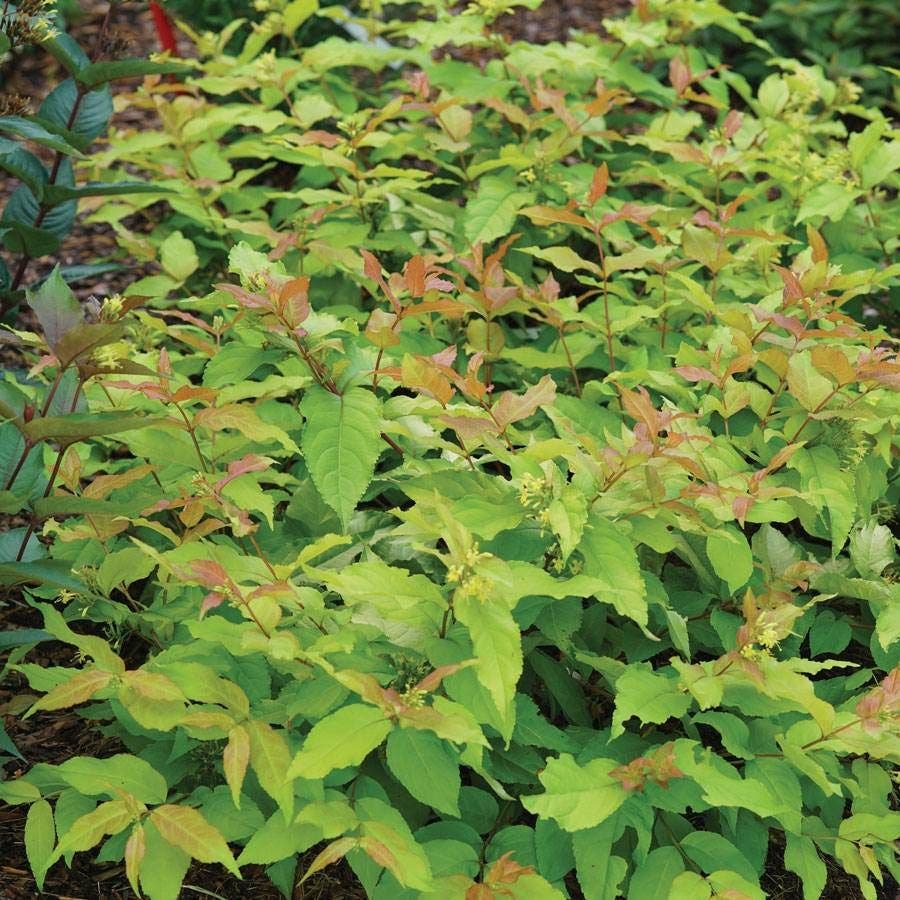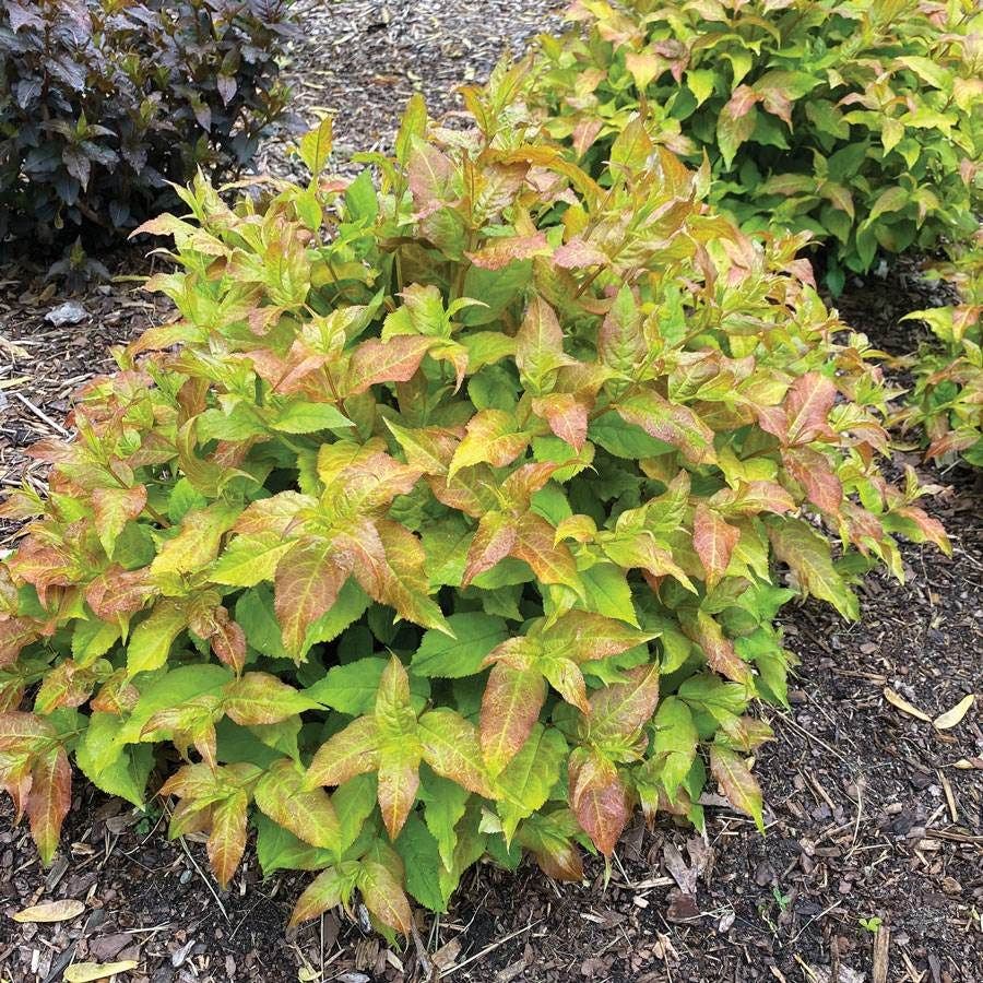A Proven Winners® variety, Diervilla Kodiak® Fresh™ is a flowering deciduous shrub offering 3 seasons of interest. Bright chartreuse foliage first emerges in orange and red hues. Tiny yellow flowers, borne in terminal clusters, appear all summer, attracting bees, butterflies, and hummingbirds. The vibrant leaves add vivid color and texture to the garden all season and are often used as foliage filler in floral arrangements. With its brilliant orange fall foliage, diervilla is an environmentally friendly alternative to burning bush (Euonymus alatus), which is invasive and being restricted throughout the U.S.