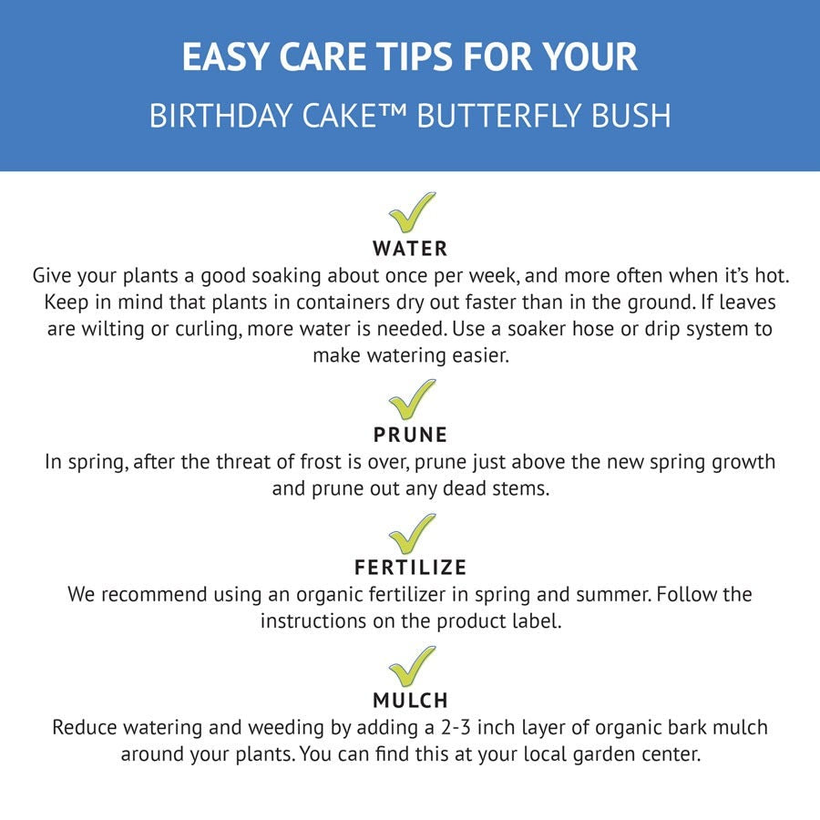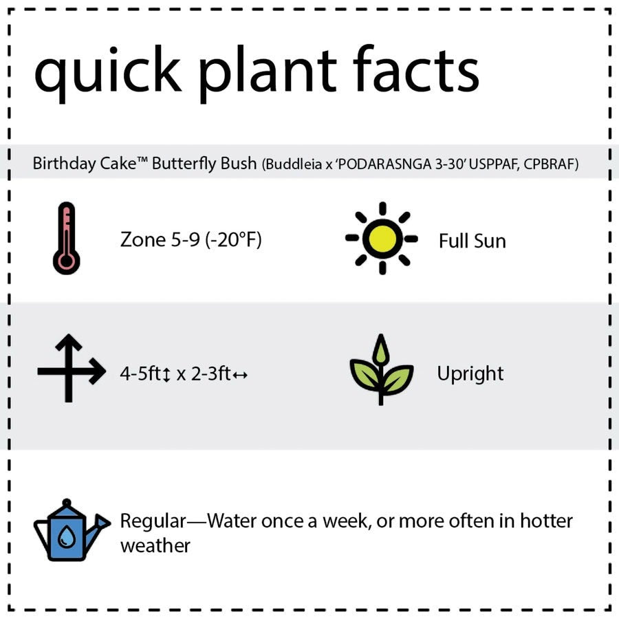 An easy-grow, easy-care shrub, Buddleia Birthday Cake performs best in sunny locations with average, medium moist, well-draining soil. The plant is heat tolerant, deer resistant, and pet friendly. Deadheading regularly encourages and prolongs flowering and discourages any unwanted self-seeding.