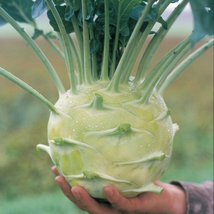 If your county fair were to hold a Kohlrabi-growing contest, all the winners would be Kossaks. This hybrid just doesn't know when to stop growing, finally topping out at about 8 to 10 inches across. Now, you'd expect a big loss of texture and flavor for all that extra flesh, but amazingly not. Kossak is actually tastier than the smaller varieties, with not a trace of the "woodiness" to which older bulbs sometimes fall prey.