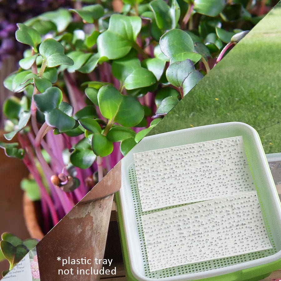 - Description / Sow Effortless Collection™ Organic Radish Sangria Microgreen Seed Mat Set of 2- Days to Maturity: 7 to 10 - The Organic Radish Sangria Microgreen Seed Mat, a standout offering in our Sow Effortless Collection™, brings an innovative approach to growing radish microgreens at home. This package features two pre-sown, 100% biodegradable grow mats for microgreens, simplifying the cultivation process and ensuring success for gardeners of all skill levels. With Sangria Radish microgreens, you're not just adding visual appeal to meals with their stunning purple shoots and bright green leaves; you're also introducing a peppery hot flavor and nutritional enhancement to your salads, sandwiches, and various culinary creations. - Our Sow Effortless Collection™ Microgreens Growing Kit is the perfect companion to our radish microgreens mats, and our Sow Effortless microgreen growing guide included on each product provides you with step-by-step instructions, from mat preparation to harvest. - But all you need to do is - Saturate the grow mats for microgreens with warm water to enhance germination and set the saturated mats on the netted tray insert located in the Sow Effortless Microgreens Kit.