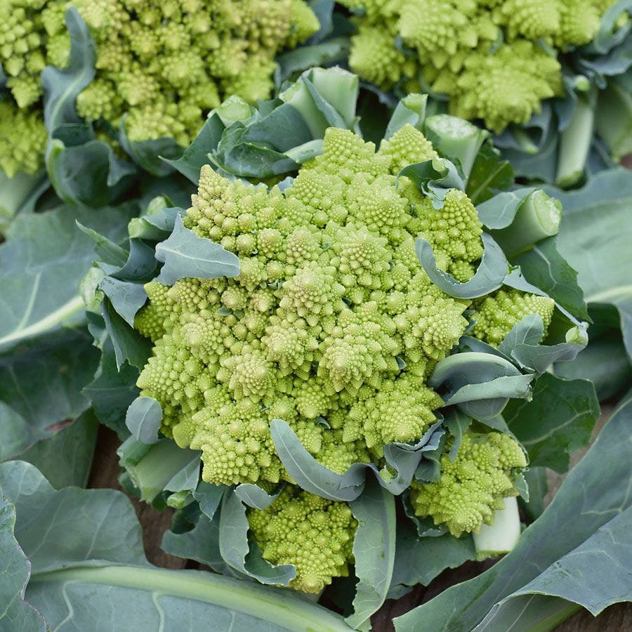 Widely grown in northern Italy, Romanesco Broccoli is grown as a flower or head vegetable. Highly ornamental as well as edible, the cauliflower-type plant sets bright green heads that have a nutty flavor and can be eaten raw or cooked. Broccoli is considered a superfood for its nutrient rich content, having a high (top 20) Aggregate Nutrient Density Index score (ANDI), or micronutrient-per-calorie density. It is high in fiber and vitamins C and K. It is a great source of calcium and iron and contains antioxidants.