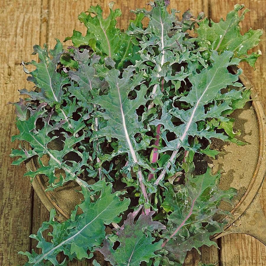 Red Russian: Is an oakleaf-shaped variety with dark green leaves sporting purple veins and stems. Very showy, it reaches 2 to 3 feet high, much larger and bushier than most other kales. Like White Russian, its flavor is improved by frost, and it will continue through winter in most climates. Highly productive and very succulent, it remains a taste-test favorite decades after its introduction.