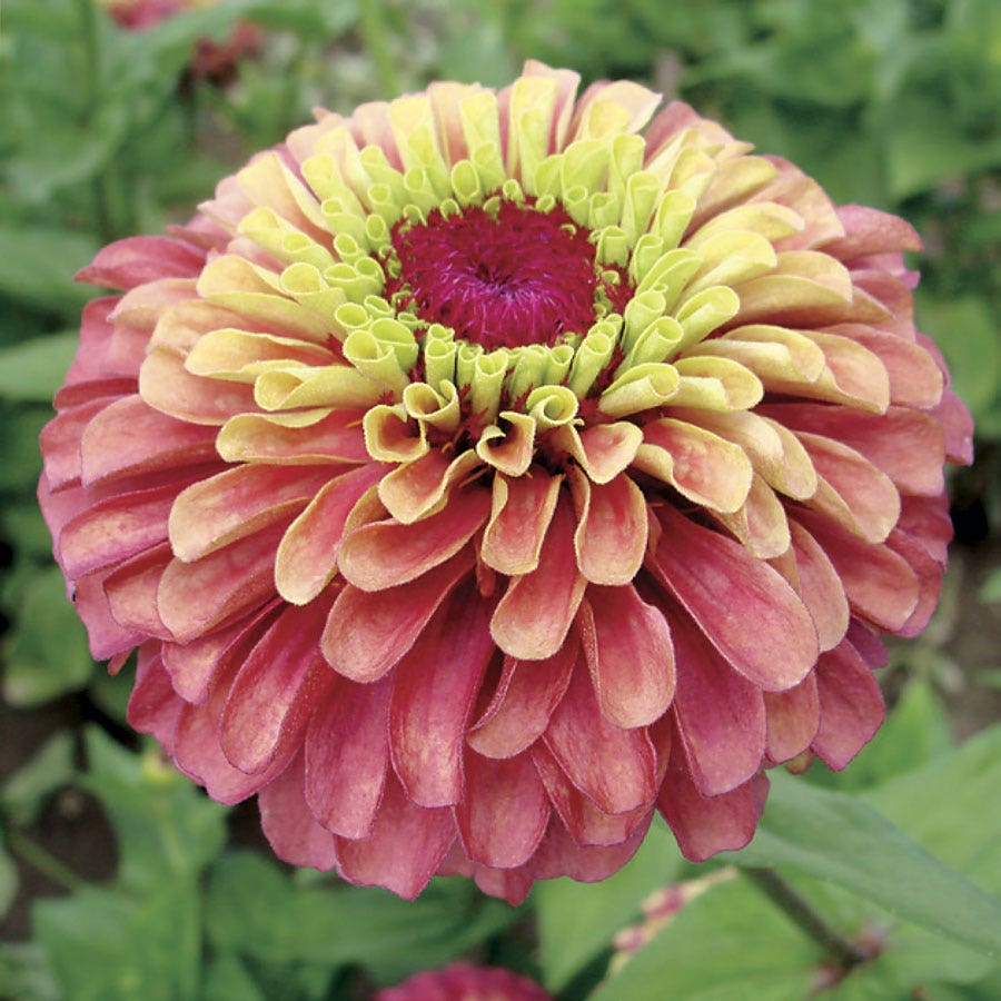 A color blend like no other in the garden (except possibly Coleus foliage), Queeny Lime Red is the zinnia of the season, the one we get daily calls and emails about. It's just so amazingthe petals shade from deep maroon at the base to fresh lime-green around the central cone, with shades of antique rose, vintage pink, and soft chartreuse in between. What's more, the flowers are fully double, very freely borne, and long-lasting in the garden or as cuts. In other words, Queeny Lime Red has it all.