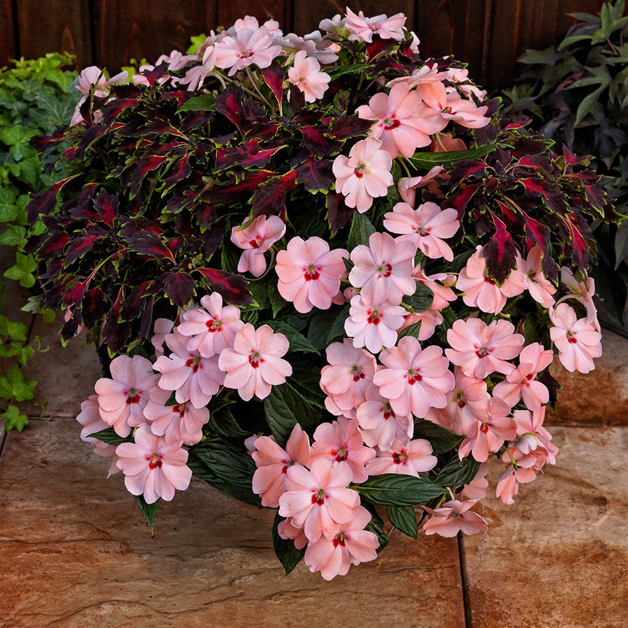 Your garden will the the life of the party with this combination of 3 Sunpatiens® Vigorous Pink Kiss and 3 Coleus PartyTime™ Red Bolero.