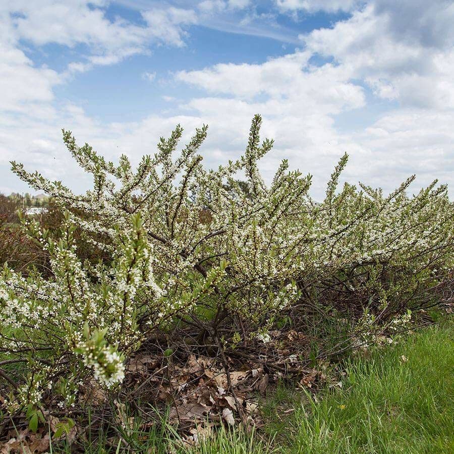 This flowering sand cherry is a must for mass planting. It has a spreading habit, but unlike most groundcovers, its branches arch upwards off the ground. It not only covers its branches in beautiful blueish green foliage that shades yellow, orange, and red in autumn, but it also produces small white flowers in spring that attract bees and butterflies and yummy black cherries in late summer. The shrub is very drought tolerant once established.