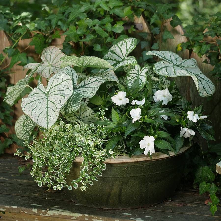 Brighten your landscape with this combination including 2 Sunpatiens® Compact White, 2 Variegated creeping fig, and 2- Caladiums White.