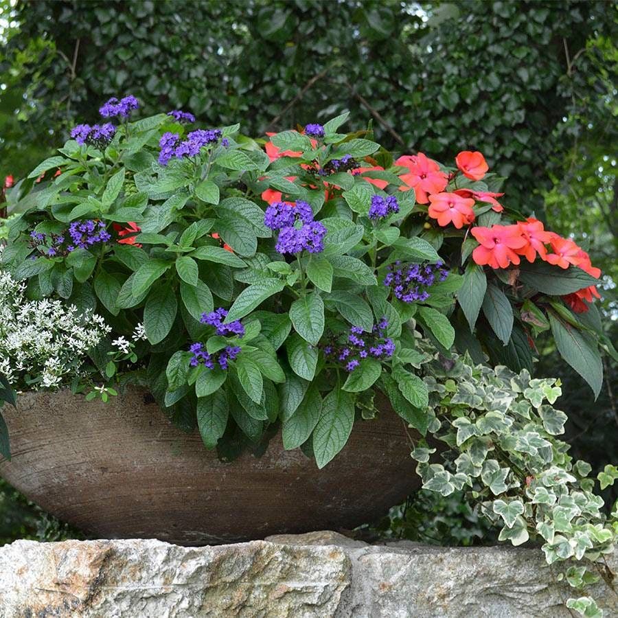 2 Heliotrope Marine is a fragrant beauty of a plant, known by older gardeners as Cherry Pie -- which tells you everything you need to know about the scent! About 10 to 15 inches high and wide, it blooms over a long season, perfuming the entire container.