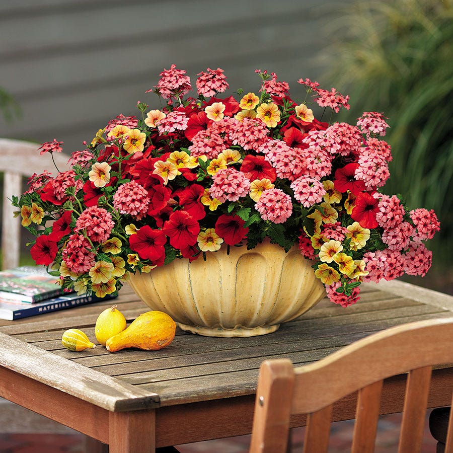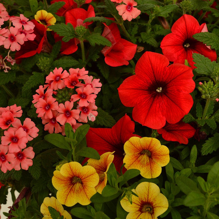 Trixi® Who Knew Orleans combines Petunia Headliner™ Red, Verbena Lascar™ Mango Orange, and Calibrachoa MiniFamous® Uno Yellow + Red Vein. Not only are these 3 of the longest-bloomning, easiest-care annuals you can grow in full sun, they also play off one another's strengths. The Petunia offers large, velvety red blooms, standouts in any setting. The Verbena sets nosegays of pinky-rosy-orange, the eye of each tiny flower contrasting with the petals, and dozens of blooms in every large cluster. And the Calibrachoa (mini petunia) offers breathtaking small blooms of soft yellow with a rosy-red tracery.