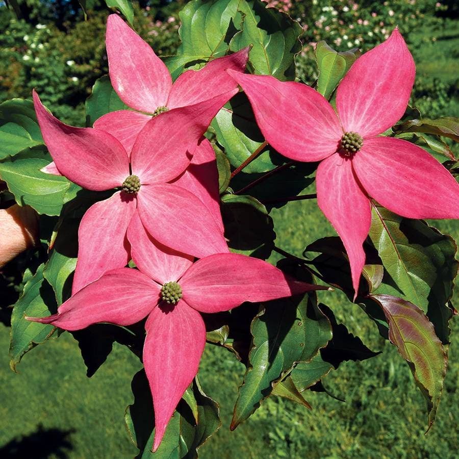 The darkest pink bracts (blooms) ever found on a Chinese dogwood can be yours with Scarlet Fire®, the exciting introduction from Rutgers University. Not a hybrid, this tree is the result of many years and countless crosses. It flowers young, offers purple tinged spring leaves, and concludes the show with bright ball-shaped carmine fuchsia berries. What could be lovelier?