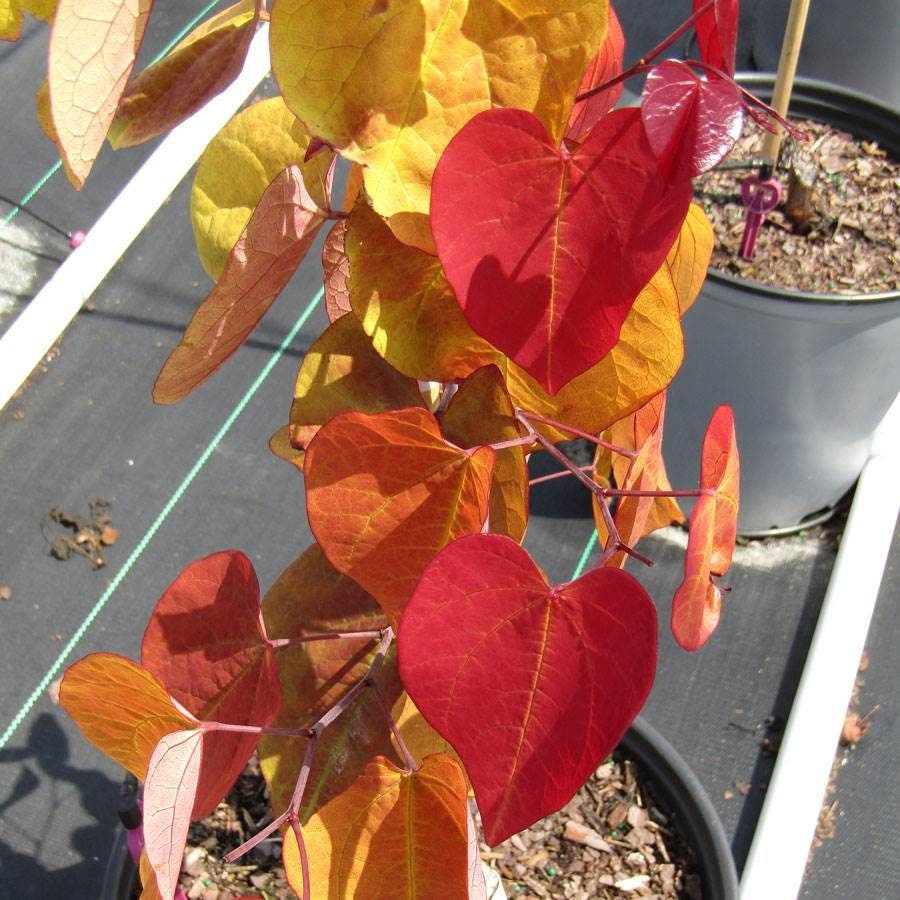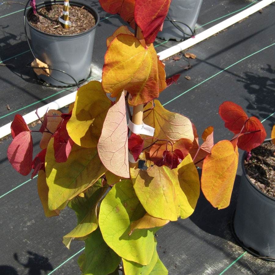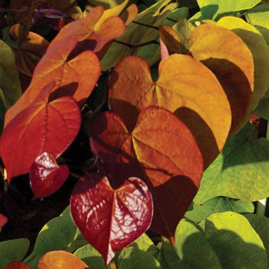 Usually the most appealing feature of a flowering tree is its bloom cycle. Not so for Flame Thrower® Redbud. Although the early spring bloom of slightly sweet-scented pink clusters of 5 to 12 flowers is quite stunning, the pure novelty of the multicolored foliage and semi-weeping form is overshadowing. The unique foliage of Flame Thrower® Redbud emerges burgundy and turns chartreuse, yellow, and green as it ages. The colors stay throughout the season, and at any given time, one branch could display several different shades all at once.