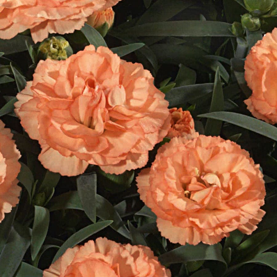 Of course, you recognize carnations as floral flowers, but this garden variety is an excellent evergreen bedding plant. Its vintage charm is especially appealing in a traditional cottage garden where its spicy clove fragrance will beckon oodles of butterflies, bees, and birds. It forms an attractive diminutive mound of grassy grey-green foliage heavily dotted with coral to apricot fully double blooms.
