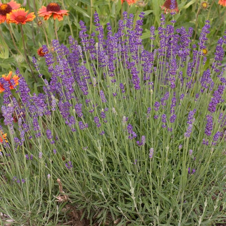 An evergreen perennial, Lavandula 'Hidcote Blue' has a subtle blue-green color and a sweet fragrance. Reaching 12- to 18-inches-high and wide, it boasts 2½-inch, linear, downy leaves on strong stems. The leaves open white then turn a pale gray-blue-green color. In summer they are topped by dark purple blooms that attract butterflies and bees.