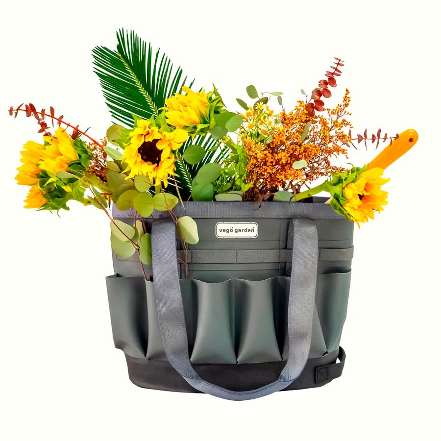 The Vego Garden Garden Bag is well made, versatile, easy to carry, and just downright handsome! Designed for comfort and utility, with storage pockets galore, this 5-gallon bag holds all the essentials for a day of gardeningsmall garden tools, gloves, fertilizers, seeds, etc., and even water bottles and cell phones. The interior has folding magnetic cup holders to secure bottles and tumblers upright inside the bag as well as a waterproof zippered internal pocket to keep your phone clean and dry. The exterior pockets are roomy and have elastic straps to secure tools as well as drainage holes for easy cleaning. The straps are wide and made of heavy-duty nylon webbing, so even when your bag is loaded to the max, it's still comfortable to carry anywhere you need it.