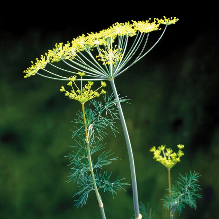 Dill is an annual with feathery blue-green leaves and tiny yellow blooms that produce masses of small brown seeds in fall. Both leaves and seeds are used in cooking, lending their flavors to everything from pickles to potatoes, eggs to fish.