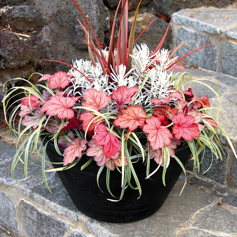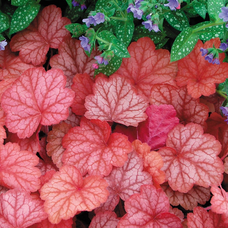 As the summer heat sets in, Heuchera 'Georgia Peach,' a highly heat- and humidity-tolerant plant, flourishes in border or container, its leaves becoming a bit less brilliant, only to rebound into glory with shades of pink, red, and burgundy in autumn. This color continues through winter in mild and warm climates, where Heuchera 'Georgia Peach' is evergreen.