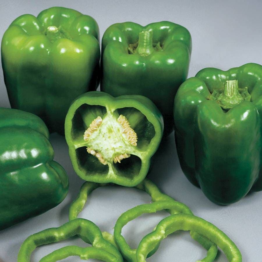 These thick-walled, blocky green bells are held vertically on the plant, so that they form with no restrictions on their shape. The result is the most perfectly-formed pepper you may ever seeas well as one of the largest. Great foliage coverage adds to the beauty and lets the peppers mature fully on the plant without scalding.