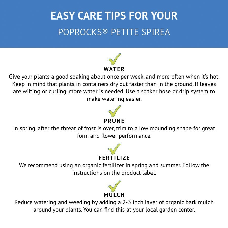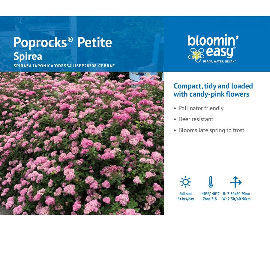 As fun and irresistible as the candy for which it's named, this petite spirea packs a punch! The bursts of dazzling pink flowers stand out beautifully against its lush green foliage and is sure to draw plenty of attention and compliments from passersby. This striking perennial flourishes in full sunlight and is quite cold hardy - handling zone 3 winters like a champion! It does best in full sunlight and works great anywhere you want to plant it. Add some beautiful pink color to your landscape with this easy to care for and low maintenance plant. Poprocks™ Petite is busy gardener's dream because it needs very little care to thrive. Basically plant it and forget it! Add this sweet treat to your garden and you won't be disappointed.