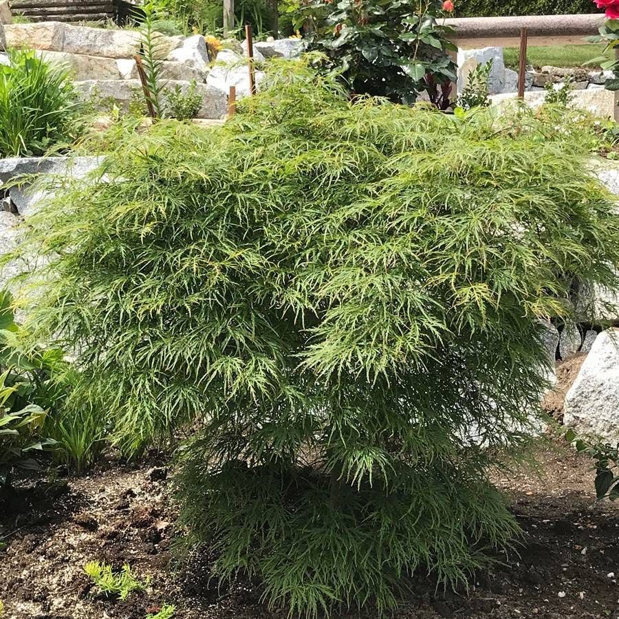 A weeping Japanese maple, prized for its foliage, Acer 'Waterfall' has exquisite finely cut lacy leaves, with deeply dissected lobes, borne on cascading branches that resemble a waterfall with age. The bright green foliage of spring and summer becomes golden in fall with touches of yellow and red.