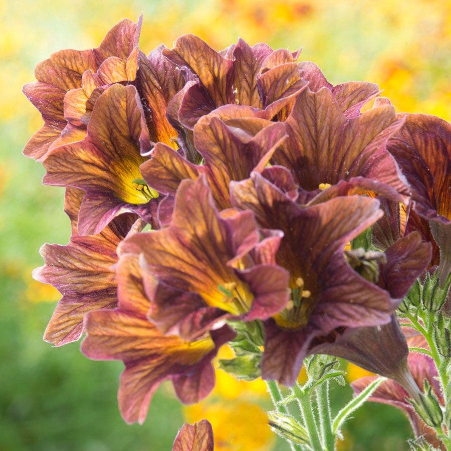 'Café Au Lait' Painted Tongue is a tropical annual that blooms in cooler temperatures, typically spring to midsummer, often with a late-season autumn bloom as temperatures drop, possibly to first frost. Borne in clusters on stout stems, the stunning 2-inch trumpet-shaped blooms have velvety petals in an unusual bronzy coffee color with deep purple veins and golden throats. The flowers attract butterflies and make distinctive cuts for floral displays.